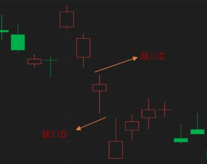 图形中 C 点和 D 点都是比较明显的向下跳空缺口。