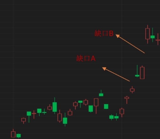 如图,图形中 A 点和 B 点都是比较明显的向上跳空缺口。