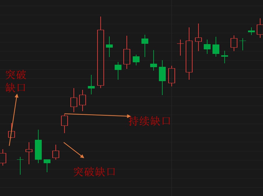 缺口如同多、空双方挖的战壕,争斗双方会在这里对峙一段时间;但一方一旦发力突破并稳住了阵脚,就会乘胜追击,而败者或且战且退,或兵败如山倒;但胜利的一方若追击过远,则往往会面临严重的补给问题,要么主动后退,要么在前线防御,但防御反而更易被对方攻破;当曾经的胜方退至战壕(缺口)时,往往又会建立据点,严防死守,期望重新夺回阵地。