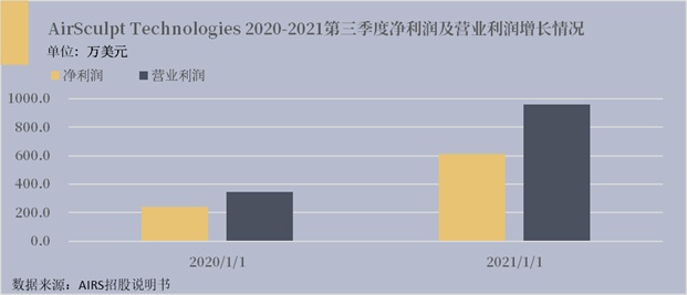 2020 年 9 月 30 日至 2021 年 9 月 30 日一年内 AirSculpt Technologies 营业利润增长了 179.0%、净利润增长了 152.6%,主要在于其门店的扩张,收入来源增多,涨幅较大,且有望保持其增长趋势。