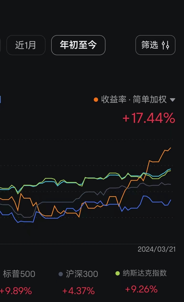 2024-03-22【美股实盘净值 2024 年第 11 次新高】【美股实盘隔夜表现点评】昨晚实盘主户持仓继续涨天天涨新高不断已经 7 连阳!实盘小户涨了两天昨天又跌回来了目前继续成本附近震荡,let it go【“事以密成言以泄败”+“黑暗森林法则”+“量子坍缩效应” 决定了若是要赚亲自下场 “淘金” 的钱则需要闷声才能发财,而若是想赚 “卖铲子” 的钱才需要大声吆喝博流量。淘金与卖铲子,二者无关高下,只是目前的盈利模式属于亲自下场 “淘金”,而非 “卖铲子”!不 “卖铲子” 无需每日更新。账户净值创历史新高更新净值曲线截图,建仓后上涨超过预期涨幅的 61.8% 更新账户持仓 K 线截图。】【活得久赚的久比赚得多更重要!时刻牢记必要时止损!止损就像 “核按钮” 平时几乎用不到但关键时刻必须要有。止损后虽然账面会亏一些但此时依然活着,活着就有机会再创新高!不止损类似闯红灯:可能大部分情况都能涨回来,但总会有 1 次被彻底消灭甚至还要负债彻底翻不了身!】【说明】做真实而又公开的实盘记录。真实,要求信息全部披露,最好代码也一并公开一览无余;公开,投资领域由于监管以及心理等各种因素所限,注定了不可能完全公开,很多东西根本就不适合在公开场合来讲。经深思熟虑,真实的,且适合在公开场合来讲的,只有账户净值从小做到大的 “逻辑连贯性”,具体体现在净值曲线变动跟持仓 K 线走势的尽可能的连续展示。代码,尤其是单一持仓的实盘代码,是暂不适合公开展示的。美股实盘每次只做一只,这只要经过十几轮各种条件的严格筛选。一旦买入持有 1-3 个月。公开记录的是美股实盘的资金曲线。实盘目前两个账户,一个主户一个小户,风格上主户是中军小户是先锋!不保证每天记录但绝对保证如实记录!净值创新高必更新!若隔夜实盘净值创新高则发文开头会标注【美股实盘净值 2024 年第 N 次新高】。文中所提及大盘皆指美股大盘指数。
