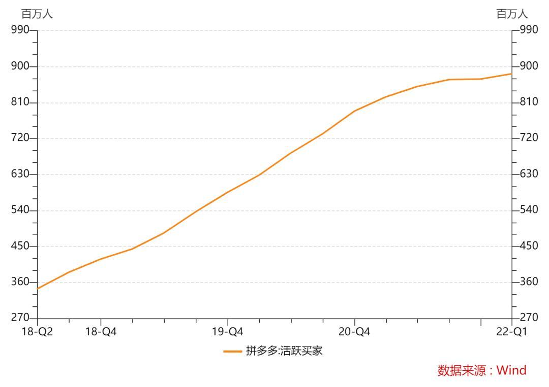 图:拼多多平台活跃买家数(2018 年第二季度至 2022 年第一季度)。资料来源:Wind