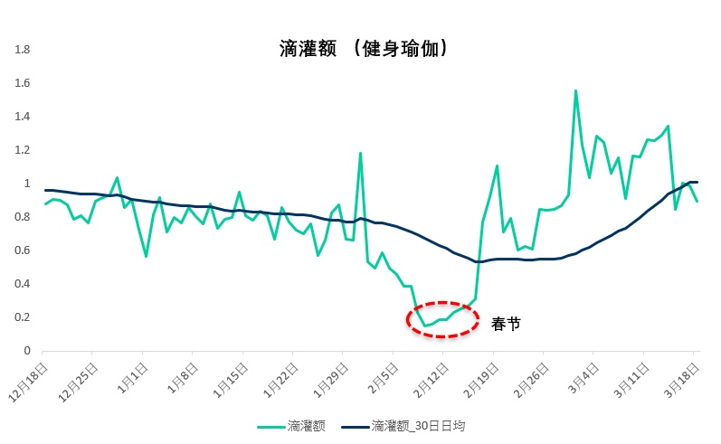 在滴灌额指数上,健身瑜伽业态(包含在滴灌通澳交所挂牌融资的 60 多家健身门店,分布在北京、上海、浙江等地)自春节后开始逐渐走高。2 月 17 日到 3 月 17 日,一个月内,滴灌额 30 日均值上涨了 100%。很多健身俱乐部和工作室趁势和电影院推出联合营销活动,希望承接电影带来的流量,扩大知名度和潜在客群。