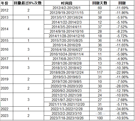 2012-2023 年纳值 100 超过 5% 回撤汇总