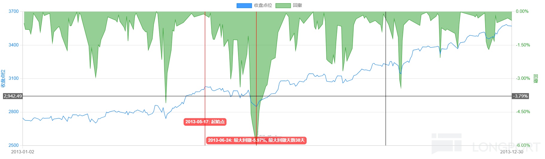 <1>2013 年大牛市,全年涨幅 34.99%。全年发生一次超过 5% 的回撤,最大回撤 5.97%,回撤时间 38 天。但接近 3% 的回撤非常多