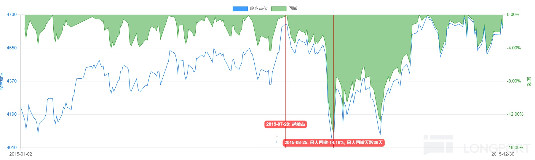 <2>2015 年,全年涨幅 8.43%。全年为发生超过 5% 的回撤 1 次,最大回撤 14.18%,回撤时间 36 天。接近 4% 的回撤非常多