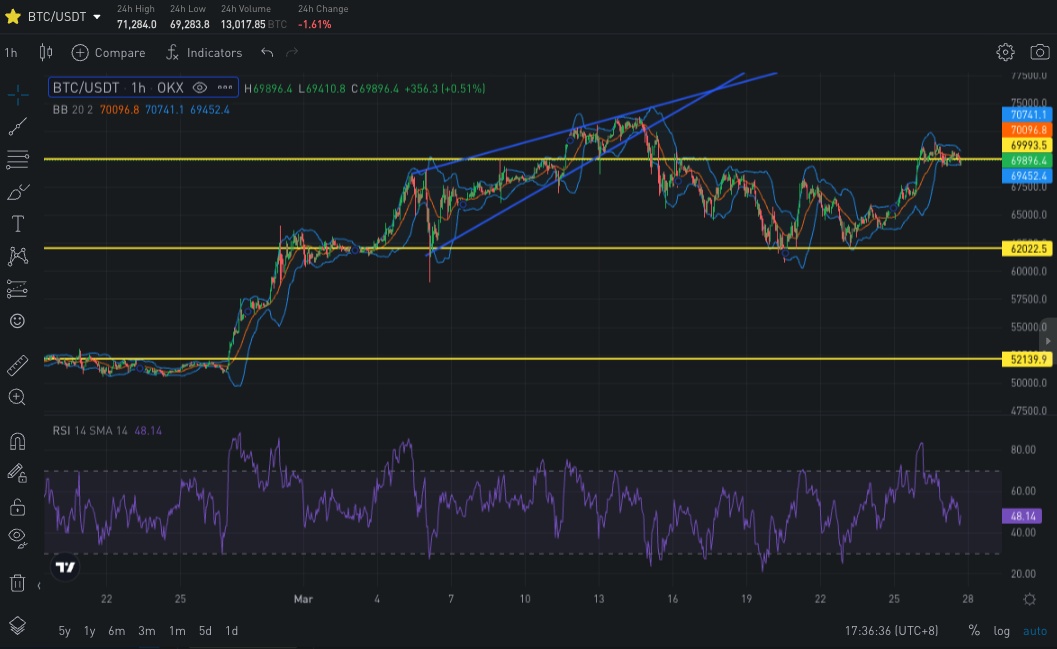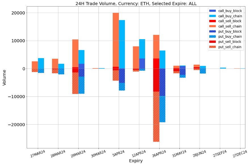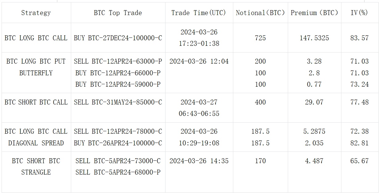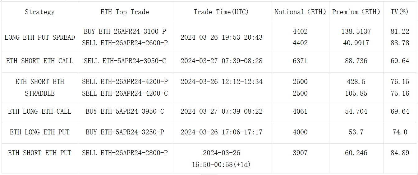 数字货币暂缓连日以来的上行趋势,在币价从近期高点轻微回落之后,BTC 和 ETH 在在过去 24 小时的大部分时间里里分别围绕着 70000 美元和 3600 美元小幅震荡,上行空间变得不那么明朗,致使期权市场下调了中前端的隐含波动率和 Vol Skew,从交易上也能看到一如 BTC Short 31 MAY 24-85000-C ,BTC Short 5 APR-68000/73000-Strangle,ETH Short 26 APR 24-42000-Straddle 为代表的看跌波动率和看弱上行动能的策略,除此之外,两币种中短期成交大多仍以防守性质的看跌价差策略作为主要基调,BTC 部分成交向中远端发生转移,其中 27 DEC 24 100000-C 获得累积 725 BTC 的大宗买入,为昨日最大开仓头寸。