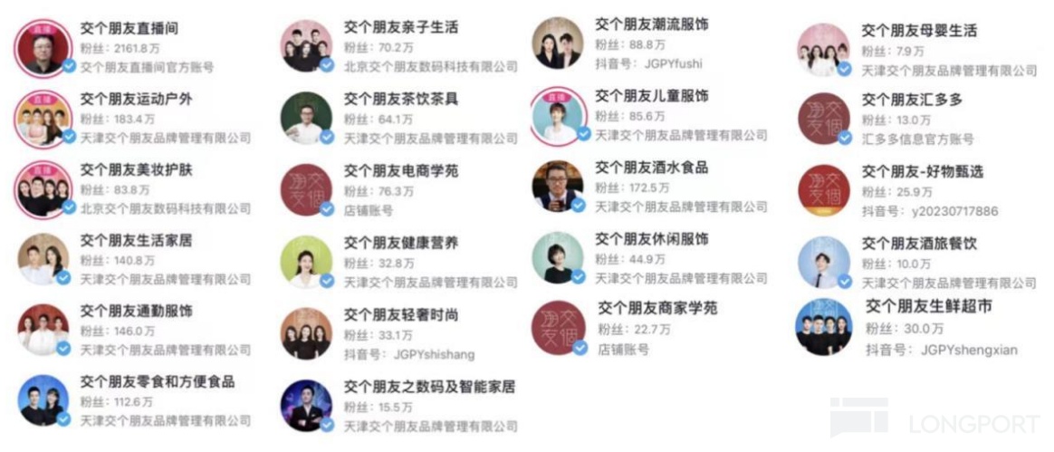 2022 年 6 月 2 日,罗永浩抖音直播间正式更名为 “交个朋友直播间”,淡化个人主播,主打自身渠道品牌 IP。“交个朋友” 由此迎来发展新阶段,以主号延伸的垂类矩阵号迅速发展,均以主号名称进行背书,共同打造公司核心渠道品牌 IP。