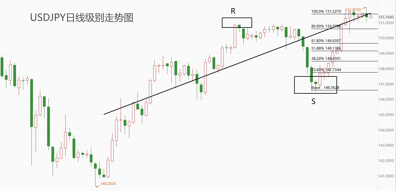 近期受到密切关注的品种还有美元兑日元。昨日,USDJPY 冲高至 151.972 点,创出有记录以来新高。日本财务省负责国际事务的副大臣神田真人表示,“日元当前的贬值与基本面不符,显然是受投机行为驱动,我们将针对汇率过度波动采取适当行动,不排除任何选项。” 能够引起日本财务省的注意,意味着日元的汇率已经处于 “极端水平”。但是,从技术角度看,USDJPY 仍具有继续上行的动力,一旦黑色回归线上方出现决定性的长阳线,USDJPY 或许将开启新一轮强势上涨波段。