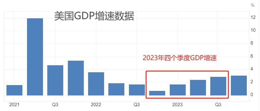 沃勒在讲话中还提到一个重要概念 “生产率”(productivity),他认为:当整个经济体的生产率快速增长时,意味着产出和收入也可以快速增长,而不会对通货膨胀造成上行压力。2023 年二季度至四季度,美国的生产率约为 4%,远高于上世纪 70 年代的水平。但是,生产率数据并不稳定,过去两年,美国的生产率仅为 1.25%。通过数字比较我们发现,沃勒所谓的生产率,主要是指 GDP 增速数据。过去五个季度,美国的 GDP 增速呈现稳步上升态势,意味着美国的商品和服务产出持续增长。增长的商品和服务总量抵消了宽松货币政策派生的需求,所以通胀率不会过度升高。沃勒把这一现象看做是 2023 年 CPI 年率数据持续稳步下降的关键影响因素。