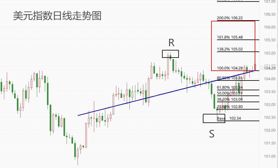 上图为美元指数的日线级别走势图。技术角度看,美元指数处于中期上涨波段之中,受沃勒讲话影响,今日盘中出现中阳线,市价可能会有效站上蓝色回归线。对于本月的中短期上涨波段来说,下方支撑位 102.34 点,上方第一阻力位 105.02,第二阻力位 105.48,第三阻力位,也是最终目标位 106.22 。达到第三阻力位时,蓝色回归线极有可能发挥向下的牵引作用,导致美元指数遇阻回落。