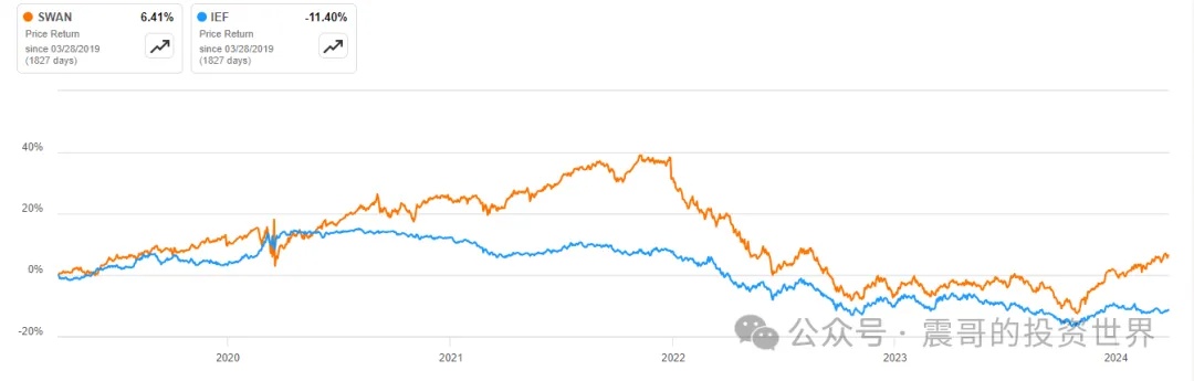 For example, the U.S. Swan Fund allocates 90% to Treasury bonds (IEF) and 10% to long-term S&P 500 Calls. Historically, SWAN has outperformed IEF significantly.