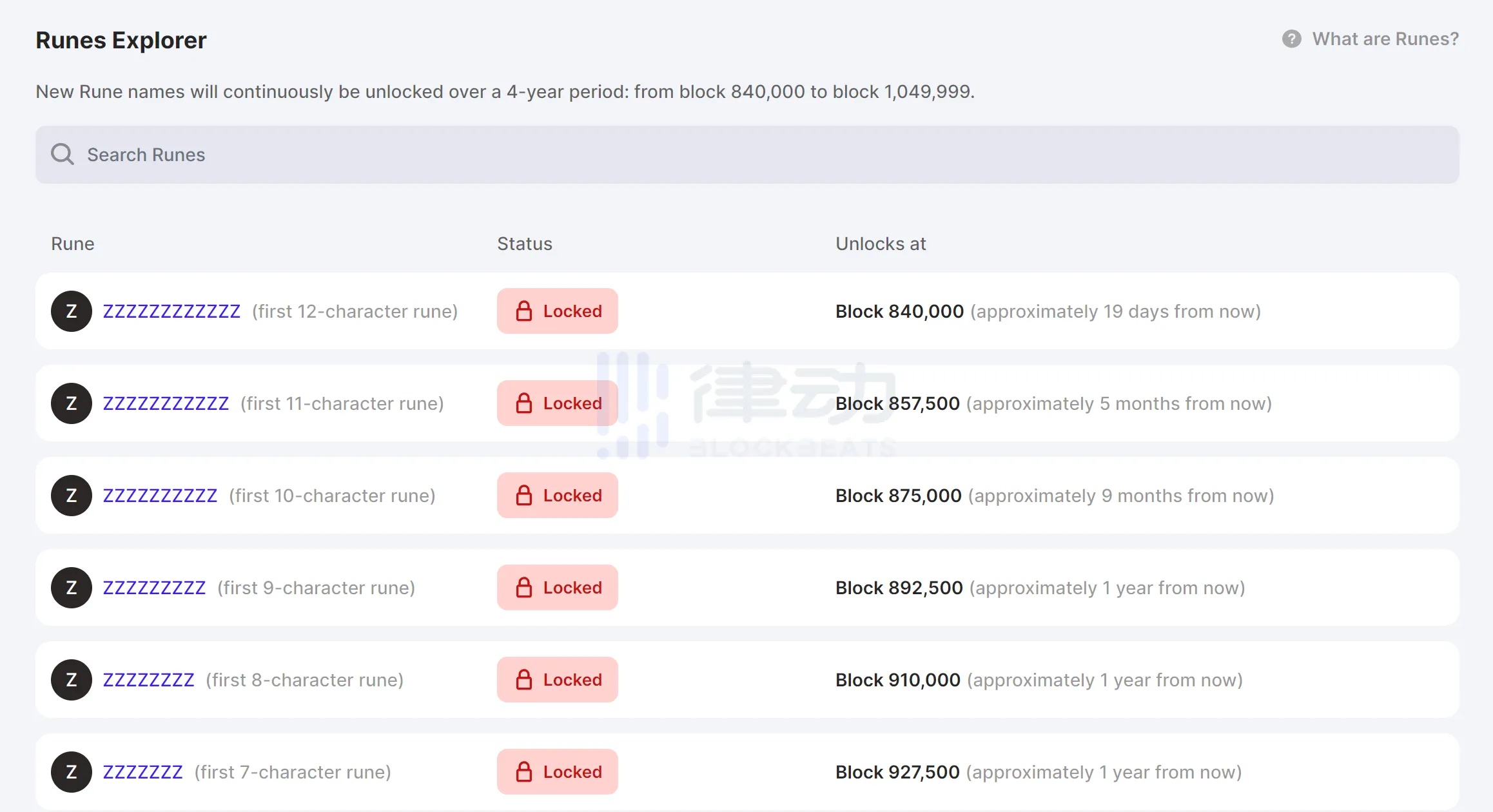 Why is the first officially unlocked "Rune" ticker "ZZZZZZZZZZZZ"? The maximum length of a "Rune" ticker is 26 characters (Casey’s hardcoded "UNCOMMON•GOODS" is an exception; also, the separator "•" is not counted within the 12-character limit to enhance recognizability, e.g., "WO•YAO•DISS•YOU"). However, it’s a reverse-unlocking process over time (blocks), gradually unlocking from longer to shorter tickers. Simply put, after "Runes" activate at block height 840,000, all 13-26 character tickers can be deployed immediately, but "ZZZZZZZZZZZZ" is the first 12-character ticker to be deployable. The 12-character tickers will fully unlock between blocks 840,000 and 857,500—every 17,500 blocks, a shorter (by 1 character) ticker will unlock. So for familiar 4-character tickers like $PEPE, we’ll need to wait about 3 years.