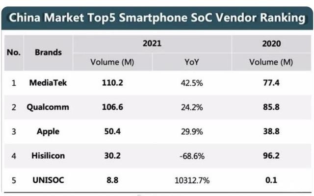 不过,值得注意的是,紫光展锐(UNISOC)的环比增长率却十分惊人,高达百余倍,究其原因,是紫光展锐在 2020 年国内市场才出货 10 万颗,基数太小。