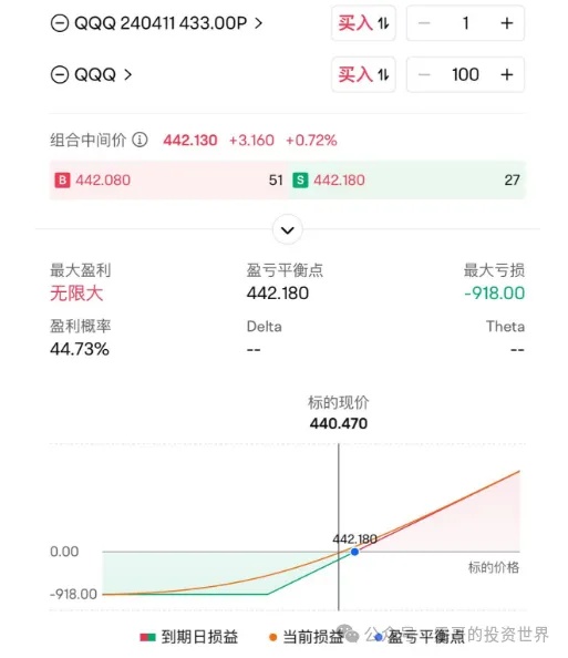 Assume the current date is April 7, 2024, with QQQ priced at 440.47. Holding QQQ and anticipating risks from the April 10 CPI release, you buy a put expiring April 11, 2024, with a strike price of 433 for 1.71 yuan.