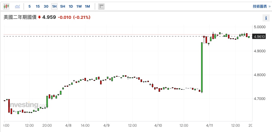Source: Investing; The US 2-year Treasury yield, sensitive to interest rate policy, surged sharply to challenge the 5.0% threshold.