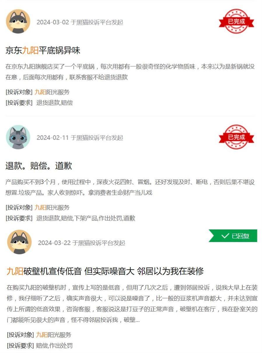 Additionally, returning to the product itself, no matter how big the brand, product quality and after-sales service cannot be overlooked. On the Black Cat 投诉 platform, there are numerous complaints about Joyoung's flagship products like frying pans and blenders, which need urgent attention. After all, consumers spend money for 放心 and 安心。
