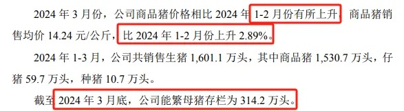 简报称 3 月猪价较前两月有所上升,仍在大部分养猪企业成本之下,但这能让养猪企业一季度亏损收窄一些,牧原一季度共销售生猪 1601.1 万头,