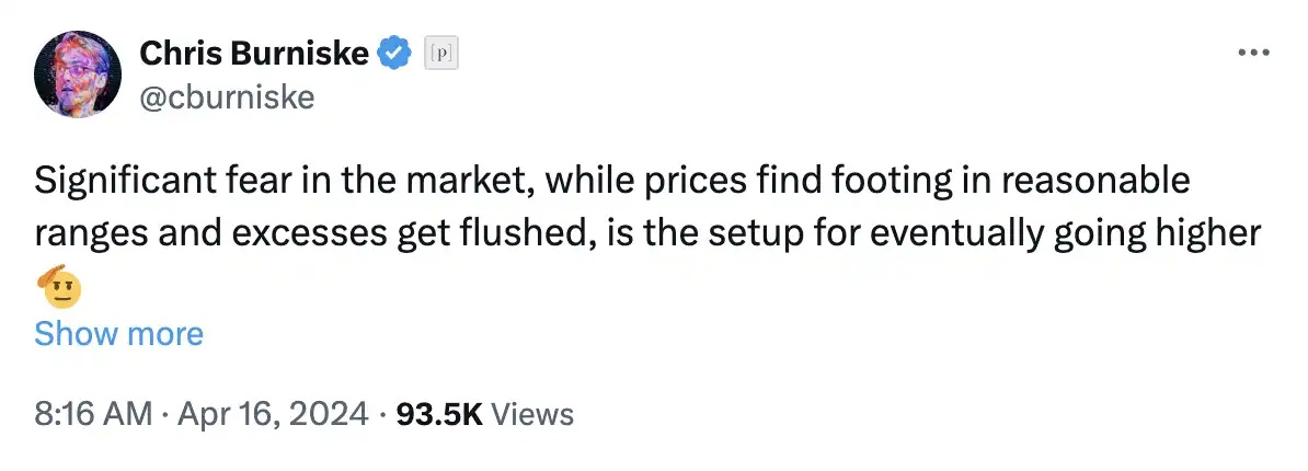 Chris Burniske, former head of crypto at Ark Invest and now a partner at Placeholder VC, posted on social media: "There is clear fear in the market, yet prices are holding within reasonable ranges. Excessive prices are being washed away, preparing for an eventual rise." Previously, Chris also stated that if tensions between Israel and Iran ease (yet to be determined), the reset of crypto leverage and the sell-off by non-committed holders would be a great start for the market entering the Bitcoin halving period.
