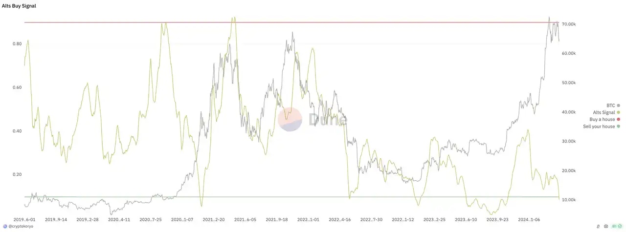 As for altcoin trading, the market has experienced much frenzy since 2024. New value coins and meme coins are competing equally, while established value coins have "collapsed," leaving many lamenting the futility of value investing. However, some crypto veterans believe we are now in the bottom range for trading. As shown in the chart below, altcoin trading signals indicate it's time to "Sell your house."