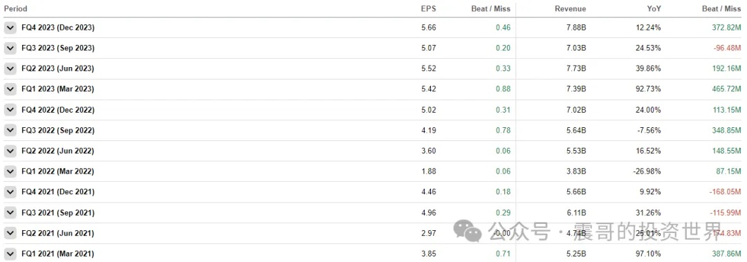 From 2021 to 2023, EPS exceeded expectations in 11 out of 12 quarters, with 1 quarter meeting expectations.