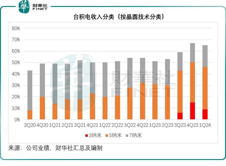 In Q1 2024, 3nm accounted for 9% of total wafer revenue, 5nm for 37%, and 7nm for 19%. Combined, advanced nodes (7nm and below) represented 65% of total revenue, up from 51% YoY but slightly below Q4's 67% (see chart below).