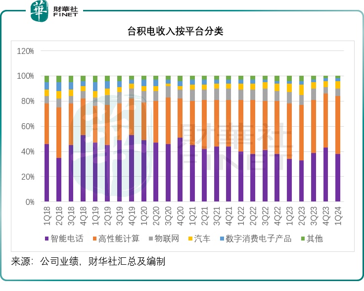 By platform, HPC revenue grew 3% QoQ, increasing its share to 46%, while smartphone revenue fell 16% QoQ, dropping from 43% to 38% of total revenue (see chart below).