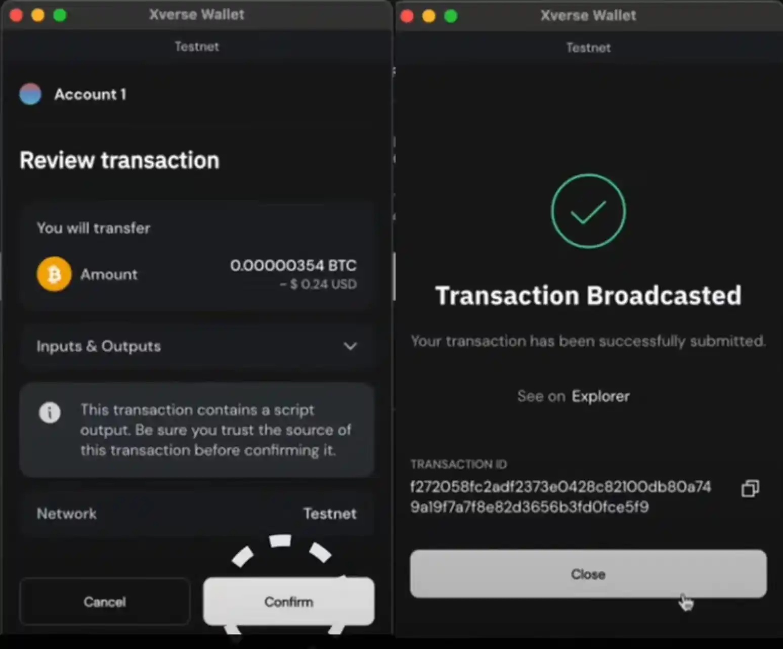 Note that the Xverse wallet mainnet has two addresses: a BTC address starting with "3" and an asset storage address (for Ordinals, Runes, rare satoshis, etc.) starting with "bc1". The testnet has one address starting with "2". If you want to interact on the mainnet, transfer the prepared BTC to the "3" address, not the "bc1" asset address.