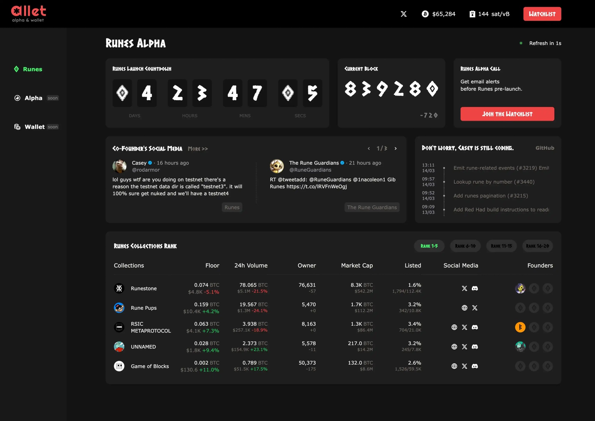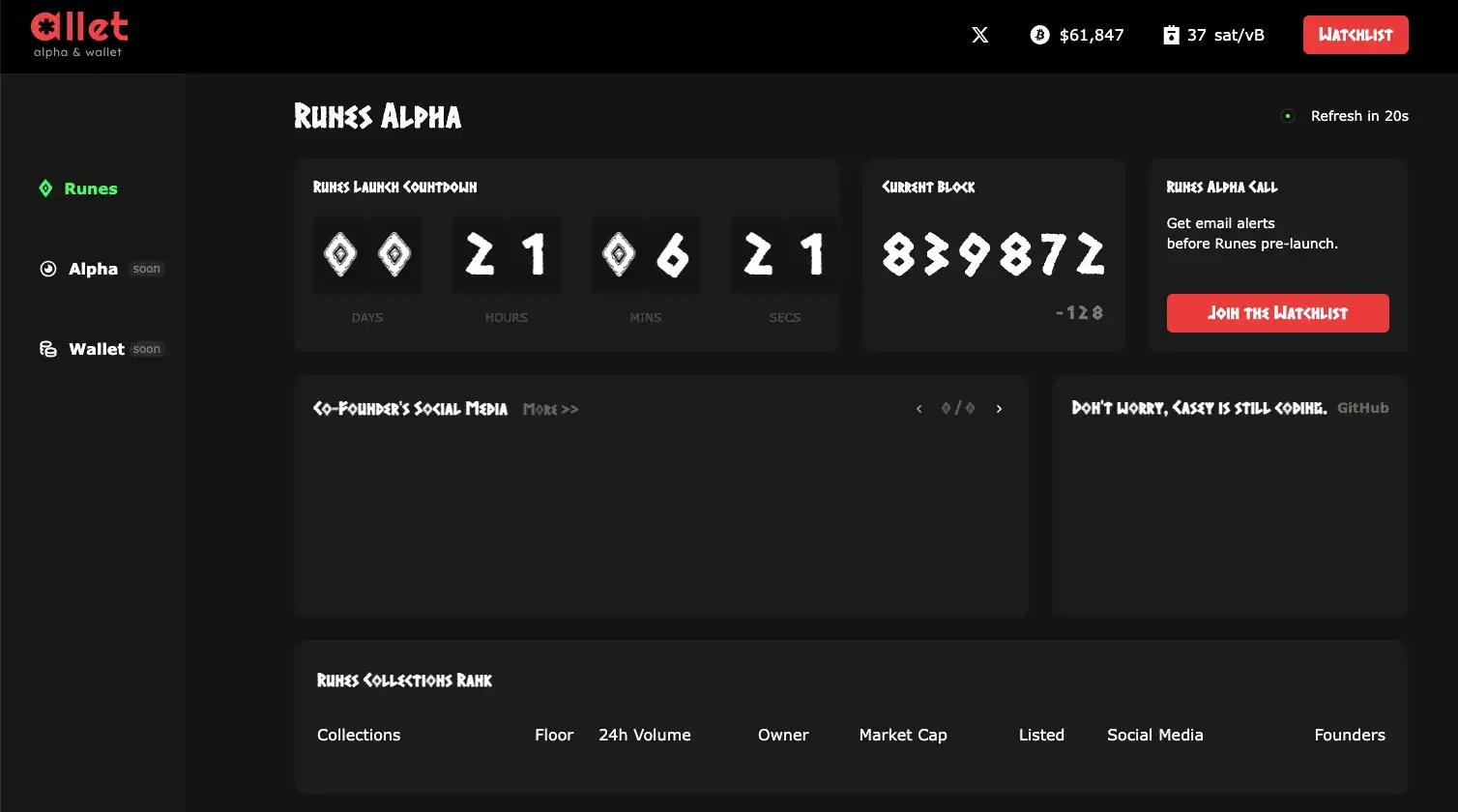 Currently, Allet has many tools yet to be launched, but according to official information, Allet will later update with important KOLs and project team social media accounts in the ecosystem to keep users informed. Additionally, it will provide detailed updates on floor prices and 24-hour trading volumes for all Runes-related collectibles, such as RSIC and Runes.