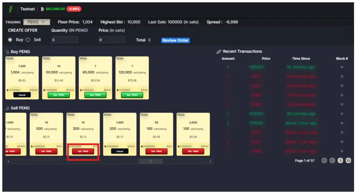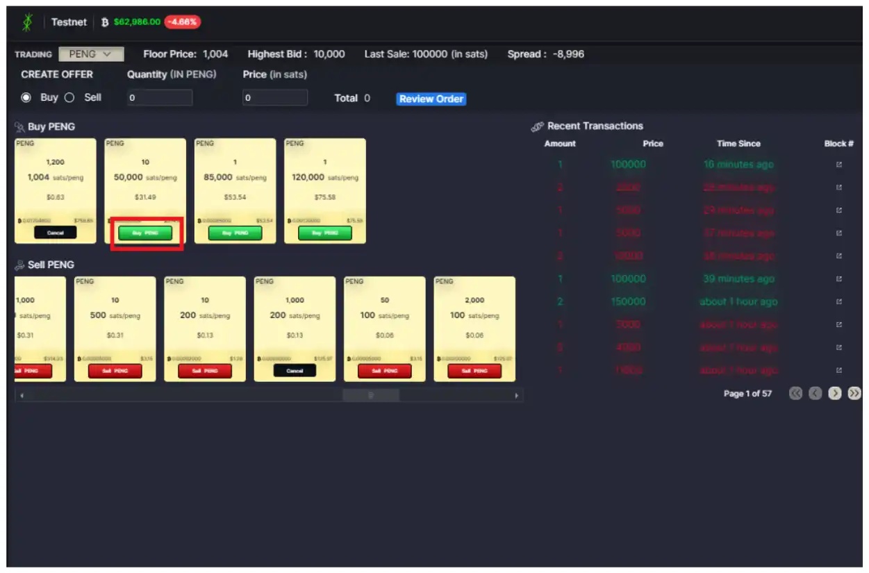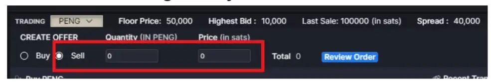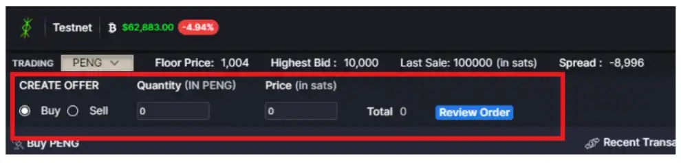 Enter the number of tokens and the price per token in sats. Review the order and confirm (note that you can only create one bid per token due to UTXO limitations). Once completed, the listing will appear as follows.