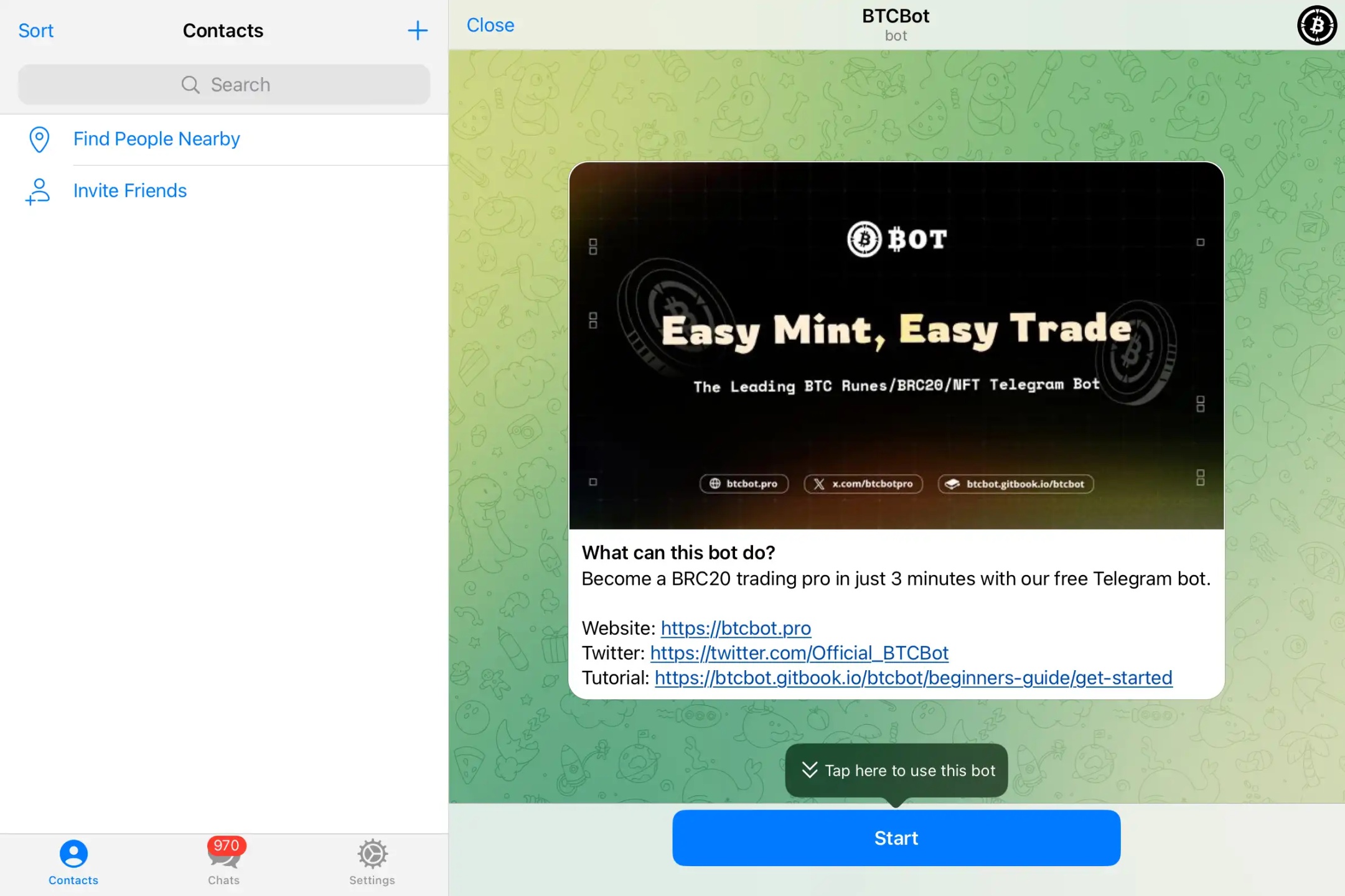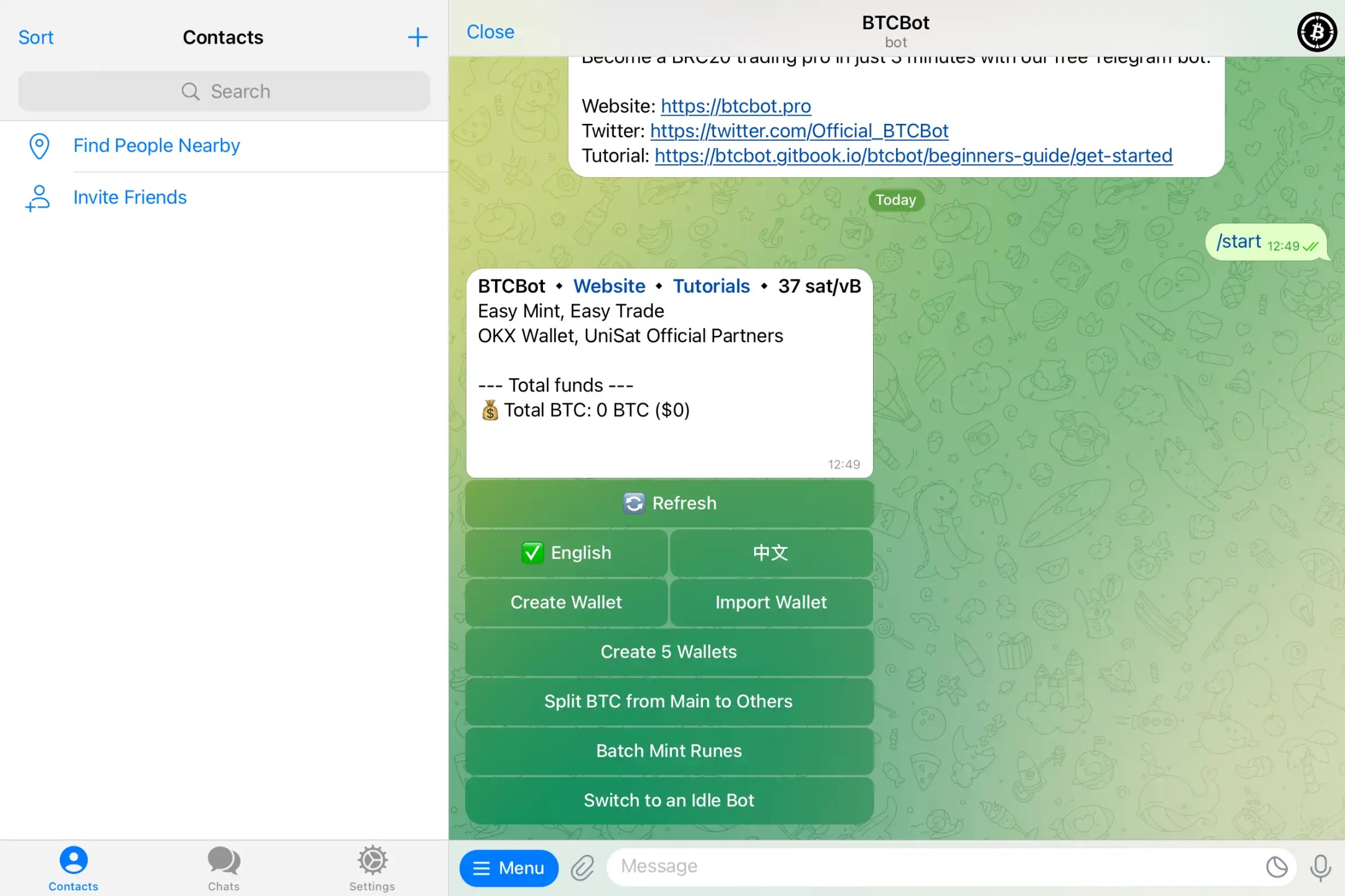 1. Open BTCBot in Telegram, click "Start" to enter the bot chat window.