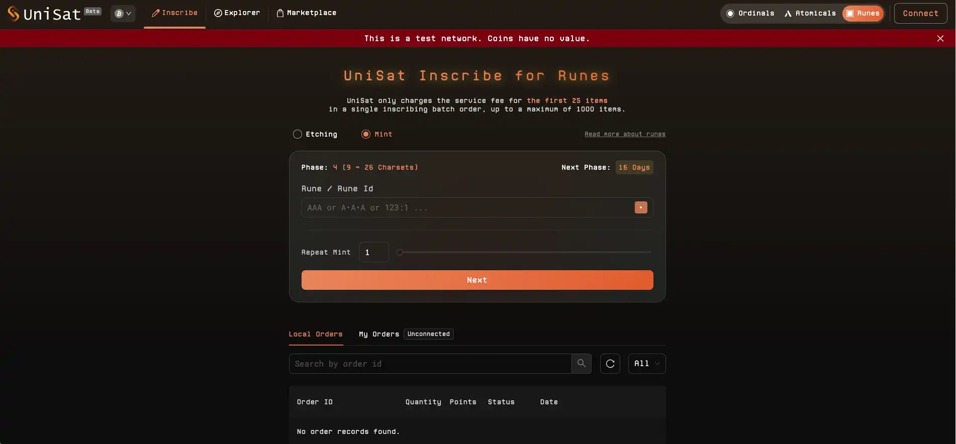 3. Open the Unisat testnet, switch to the "Mint" option on the "Inscribe" page. In the "Rune / Rune Id" column, enter the name of the Runes you want to mint. In the "Repeat Mint" column, manually enter or use the slider to determine the number of Runes to mint. After confirming, click "Next."