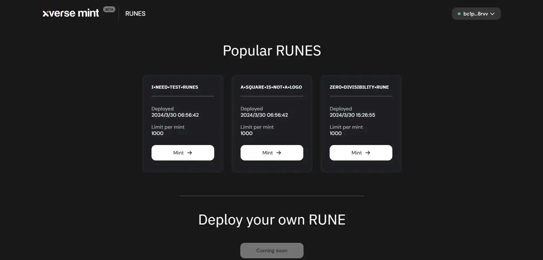 Xverse provides three different Runes test coins for minting: "I•NEED•TEST•RUNES," "A•SQUARE•IS•NOT•A•LOGO," and "ZERO•DIVISIBILITY•RUNE." All three were deployed on March 30 and are for testing only, with each mint yielding 1000 units.