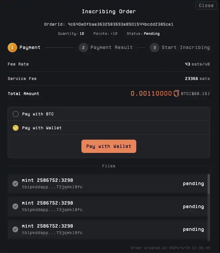 5. Finally, choose a payment method and sign to pay. If you choose wallet payment, ensure the wallet has sufficient balance; otherwise, the payment will fail. After successful payment, wait patiently for block confirmation. You can check the progress in the mempool, and the minted Runes will appear in the wallet once completed.
