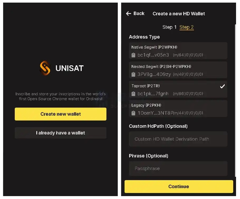 2. In the Chrome browser extensions, open the Unisat plugin. New users should select "Create new wallet" on this interface. After entering a password, a 12-word mnemonic phrase will pop up. Back up the mnemonic phrase, select the address ending with m/86/0/0/0/0, and click "Continue" to complete the creation.