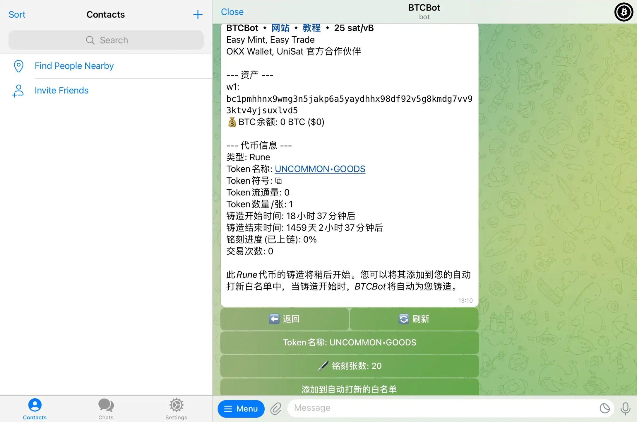 4. Select the bot's "Batch Mint Runes," enter the name of the Runes you want to mint. Using UNCOMMON•GOODS as an example, the bot will display basic information about UNCOMMON•GOODS. If you confirm the mint, click "Add to Auto-Minting Whitelist." When minting begins, the bot will automatically mint. The number of inscriptions can also be set directly via chat with the bot.