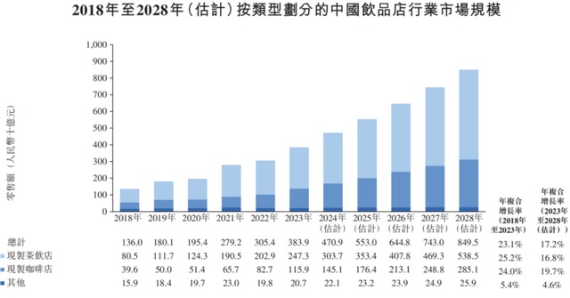 According to Frost & Sullivan, the size of China's beverage store market has gradually accelerated with the improvement of people's living standards, increasing from RMB 136 billion in 2018 to RMB 383.9 billion in 2023, with a compound annual growth rate of 23.1%.