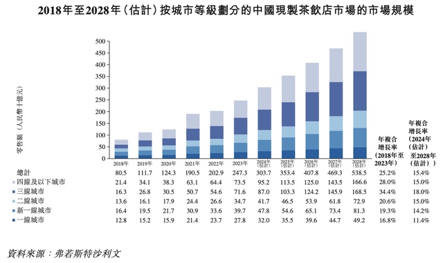 Divided by different city tiers, freshly made tea beverage stores are expanding rapidly in new first-tier cities, third-tier cities, and fourth-tier and lower-tier cities, with market sizes increasing from RMB 16.4 billion, RMB 16.3 billion, and RMB 21.4 billion in 2018 to RMB 39.7 billion, RMB 71.6 billion, and RMB 73.5 billion in 2023, respectively, with compound annual growth rates of 19.3%, 34.4%, and 28.0%.