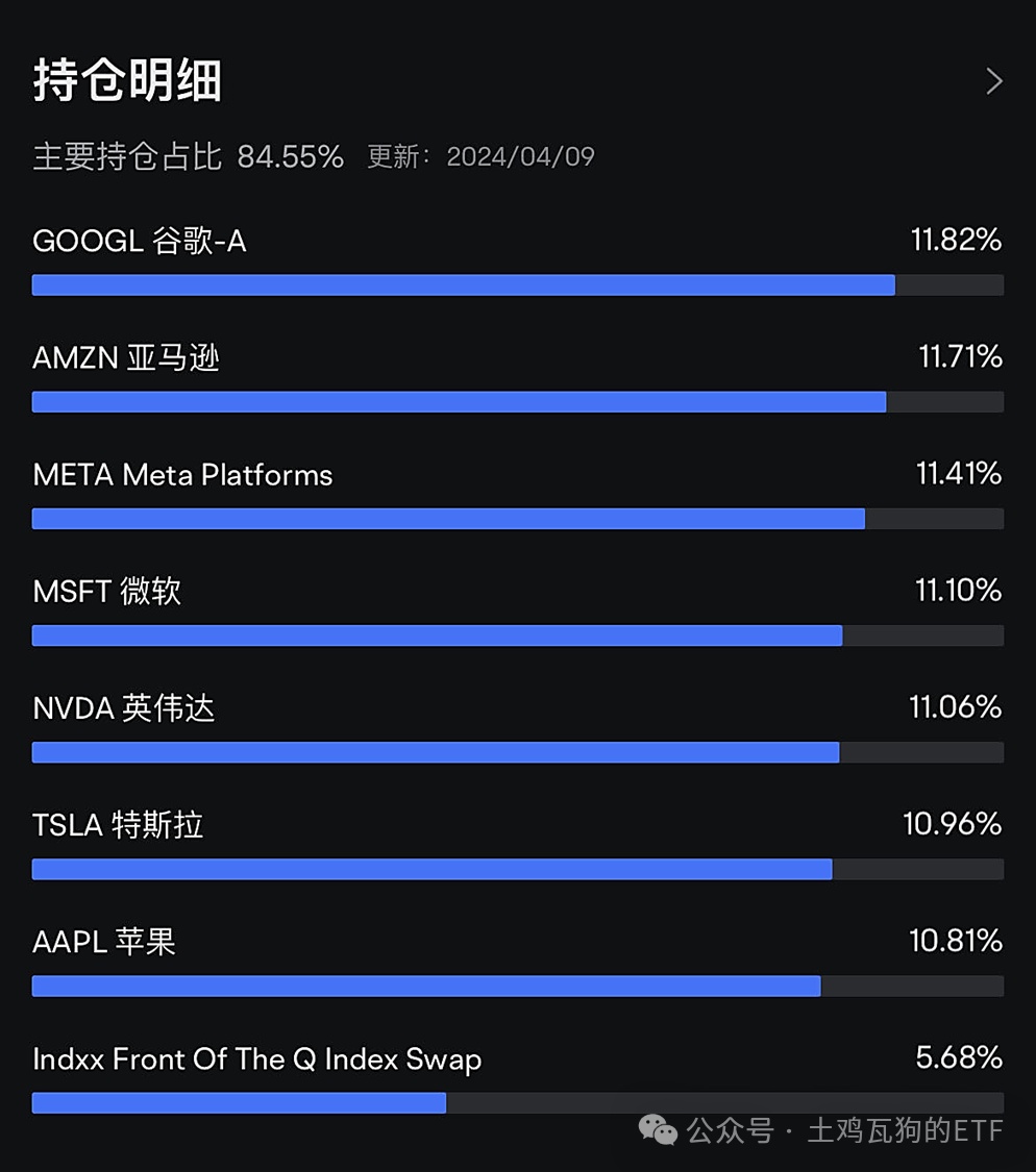 1. QQQU Holdings: Apple AAPL, Microsoft MSFT, Google Alphabet, Amazon AMZN, NVIDIA NVDA, Tesla TSLA, and Meta Platforms (Facebook's parent company). These seven tech giants account for about 80% of the holdings. These companies are at the forefront of technological innovation, continuously launching new products and solutions, such as Apple's iPhone, Microsoft's cloud service Azure, Google's search engine and AI technology, Amazon's e-commerce and cloud services, NVIDIA's GPUs, Tesla's electric vehicles and clean energy solutions, and Meta's social media platforms and VR technology.