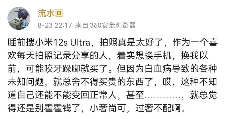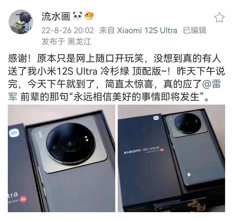 Liushuihua was an active illustrator on Weibo and a Xiaomi fan who loved photography and sharing. Due to illness and financial constraints, he couldn't afford the newly released 12S Ultra. With the blogger's consent, the Professor initiated a fundraiser in the shareholder group. Despite having only 150 members at the time, 40 friends quickly contributed and completed the donation—truly making "awesome things happen." When I shared this story with Lei Jun, he was deeply moved.
