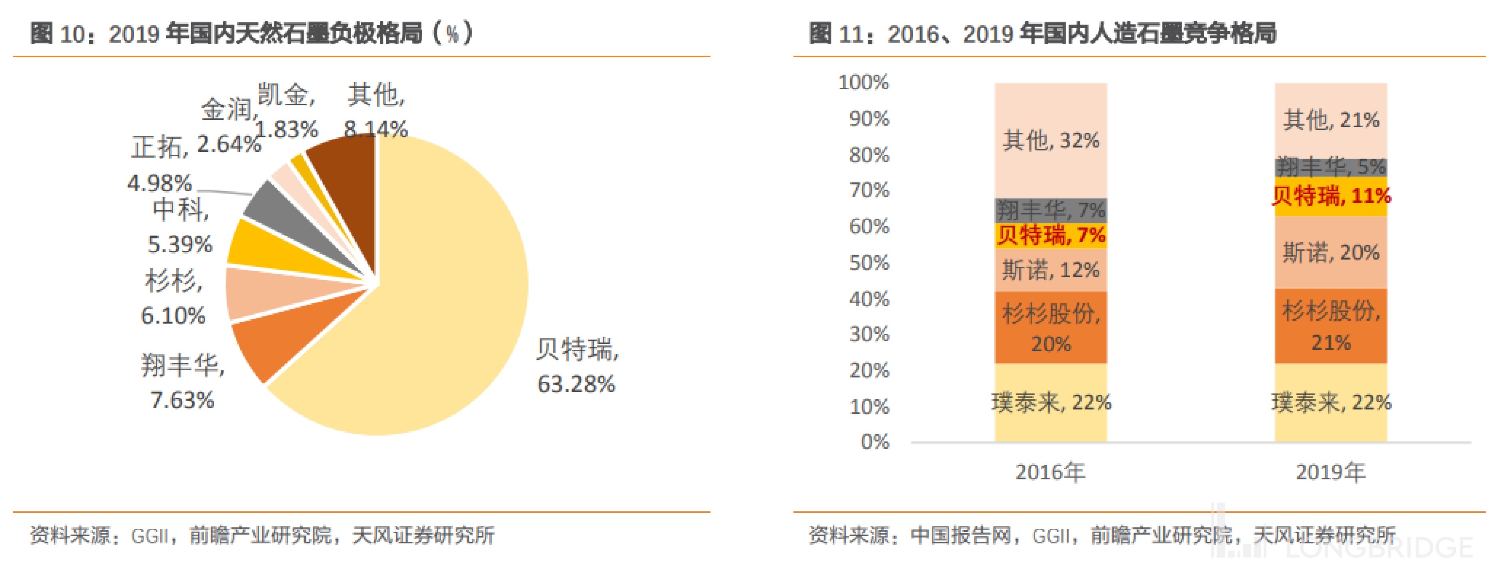 从竞争格局啦爱看,2019 年贝特瑞占据国内天然石墨 63% 的产量,在人造负极领域,贝特瑞落后于璞泰来及杉杉股份。