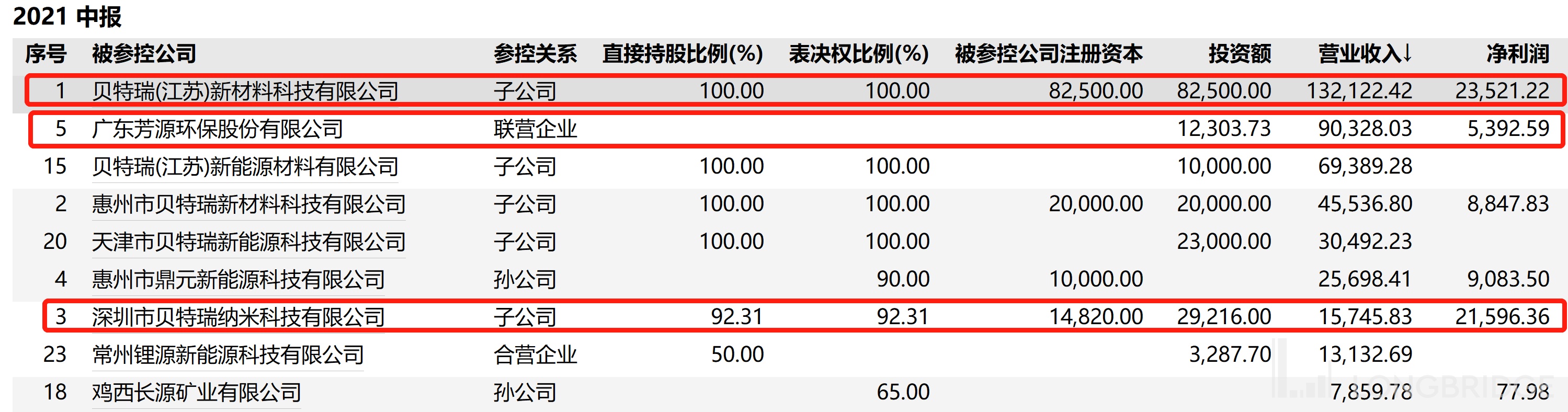 公司主要的子公司,包括江苏、深圳、惠州贝特瑞,芳源环保。