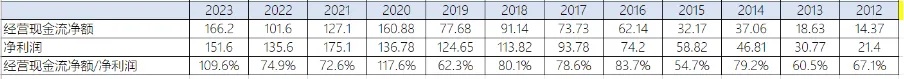 As shown in the chart, over the past 11 years, Hikvision's ratio of operating cash flow to net profit averaged 78.4%, indicating slightly lower quality of net profit.