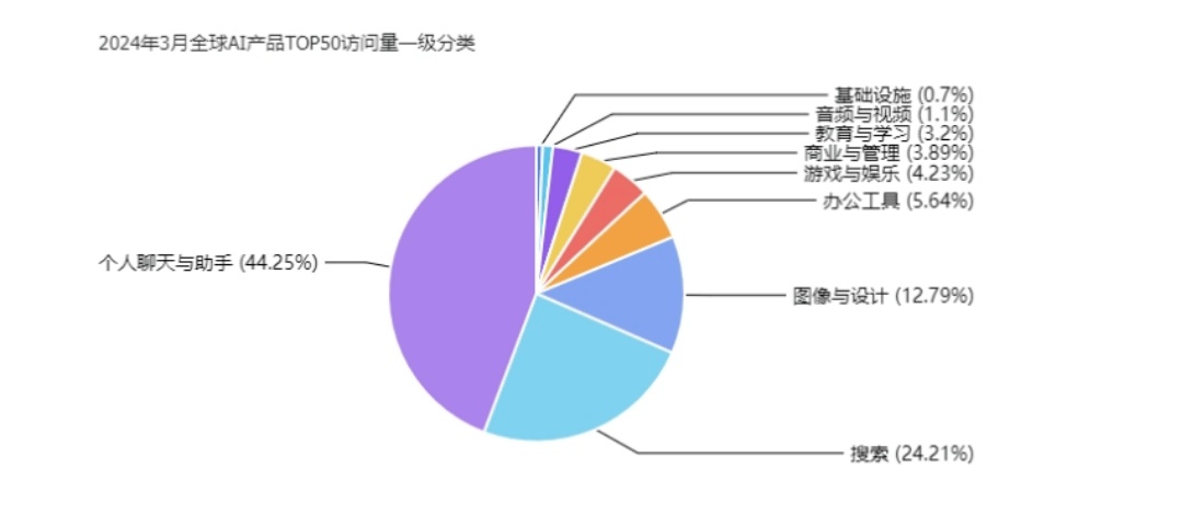 In March 2024, according to Feifan Research's global AI product traffic data, personal chat and assistant tools ranked first, accounting for 44.25% of visits. AI search followed closely at 24.21%.