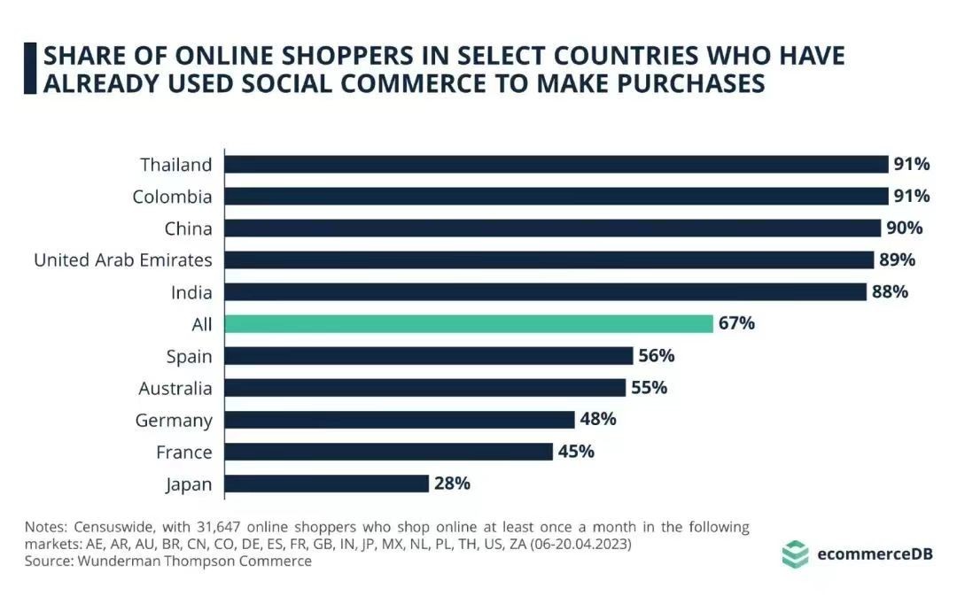 Global social commerce penetration averages 67% (vs 90% in China/Thailand). ecommerceDB projects sector growth from $724B (2022) to $6T (2030). SHEIN leveraged influencer marketing to expand globally early on.