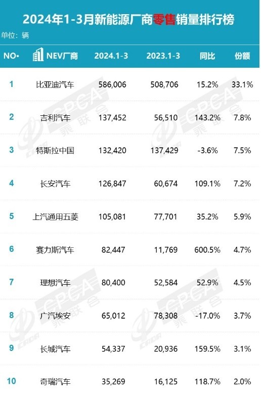 Geely’s Q1 retail sales grew 46.2%—#2 among top 10 automakers. NEV sales rose 143.2%, ranking #2 among Chinese brands.