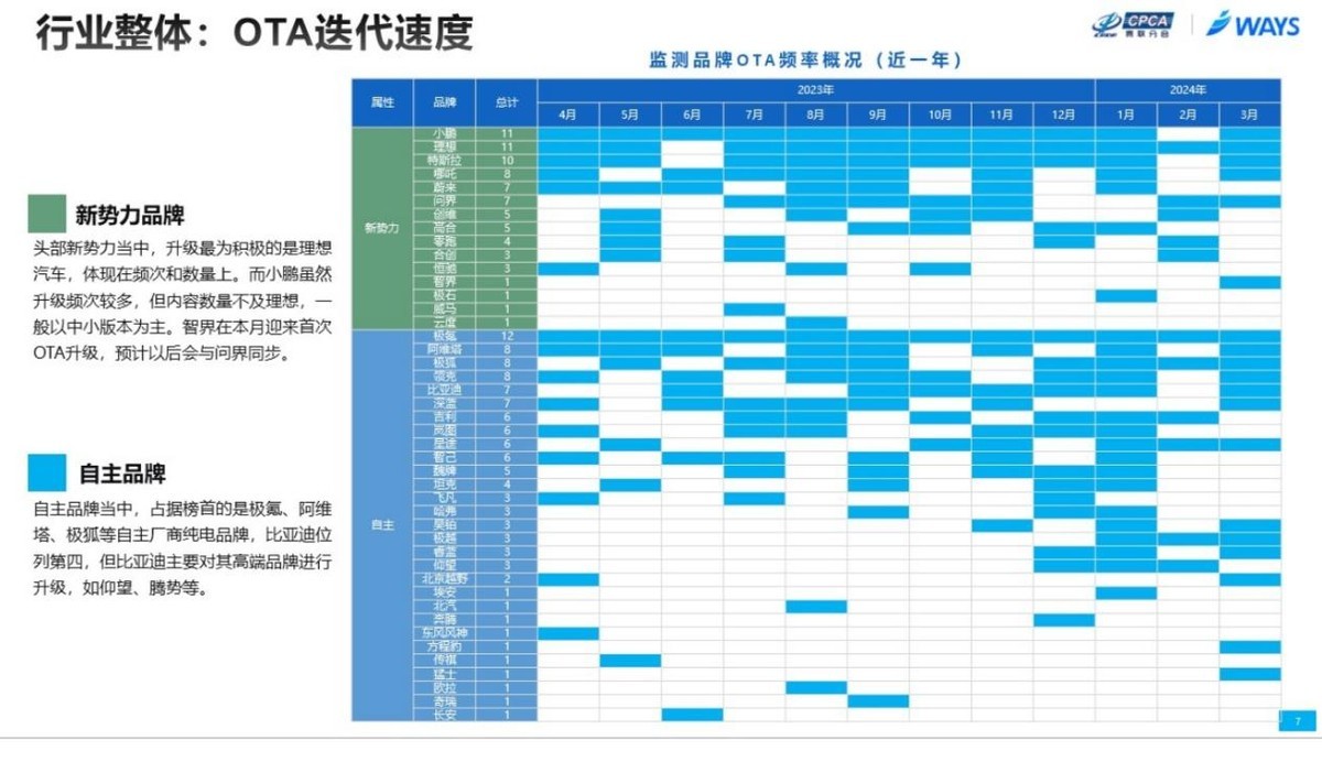 For OTA updates, ZEEKR was the only brand with monthly upgrades in 2023.4–2024.3; Lynk & Co and Geely also ranked top.