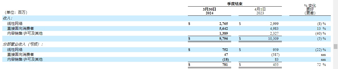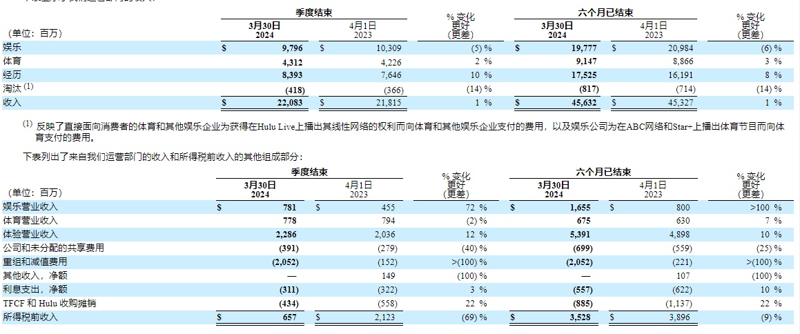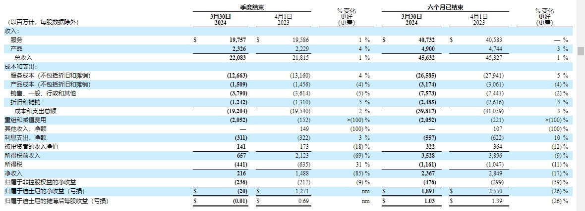 On Tuesday, May 7th, before the US stock market opened, Disney released its fiscal year 2024 second-quarter earnings report for the period ending March 30, 2024. The company reported revenue of $22.08 billion, a 1% year-over-year increase, which fell short of market expectations of $22.15 billion.$Disney(DIS.US)$Dow Jones Industrial Average(.DJI.US) $S&P 500(.SPX.US) $NASDAQ Composite Index(.IXIC.US) $Hang Seng Index(00HSI.HK) $Netflix(NFLX.US)$Invesco QQQ Trust(QQQ.US)