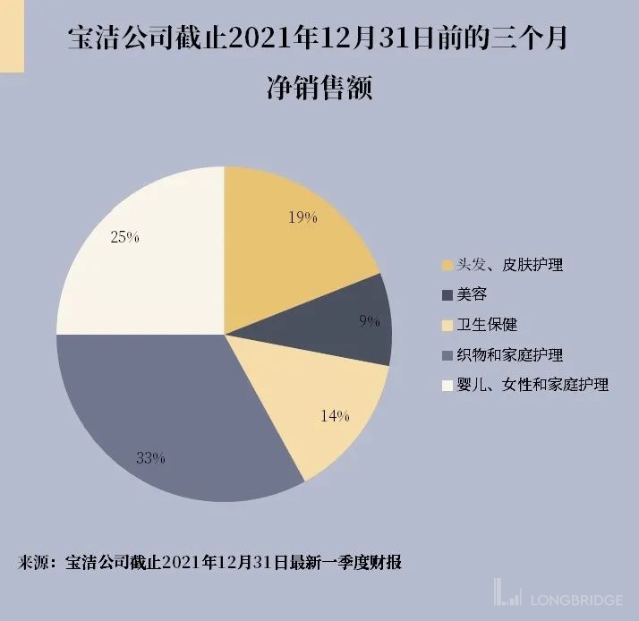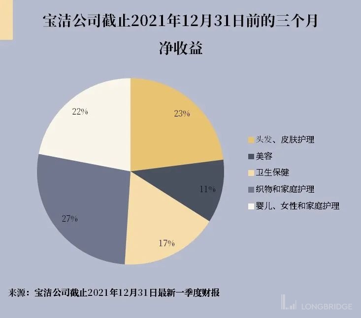 如下图可知,宝洁公司截止 2021 年 12 月 31 日前的这一季度,美容业务和婴儿、女性和家庭护理业务以及头发、皮肤护理业务分别占净销售额的 33%、25% 和 19%,相比卫生保健和织物和家庭护理业务比较重要。净收益上,美容业务有所下降但仍占较重要的位置,而卫生保健占比有所提升。