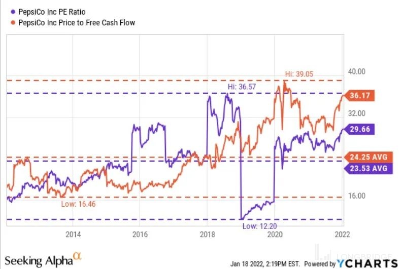 在最新一季度的财报中显示净销售额增长 6%,达到 210 亿美元;营业收入从去年同期的 52.81 亿美元降至本季度的 50.23 亿美元,同比下降 4.9%;摊薄后每股收益也从 2021 年第一季度的 1.63 美元降至 2022 年第一季度的 1.61 美元,同比下降 1.2%。表明宝洁公司盈利能力有下降的趋势。而宝洁公司的交易价格是自由现金流的 27.5 倍,表明其内在价值存在被高估的风险。